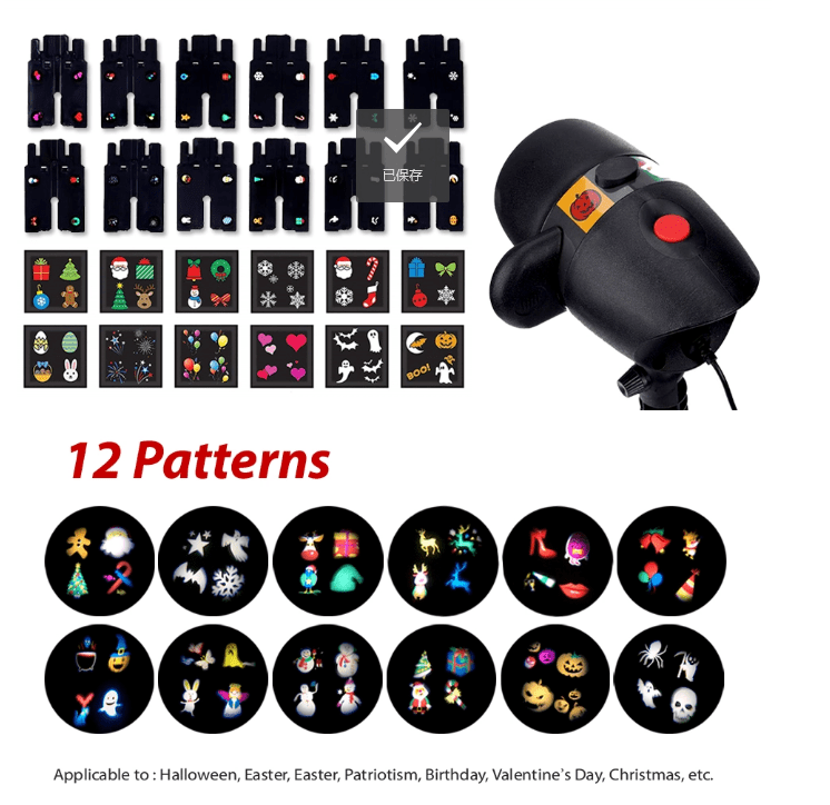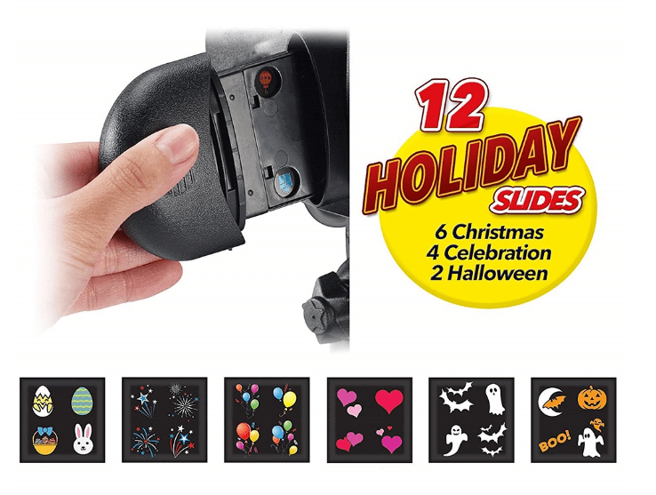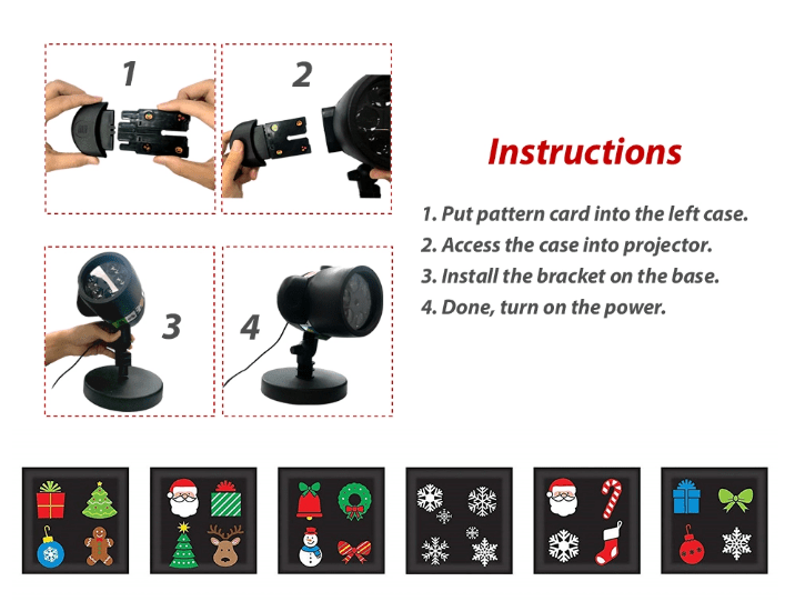 Сетот содржи 12 слајдови со различни мотиви. Едноставно, одберете го омилениот мотив, приклучете го адаптерот во струја и леќата на ласерскиот проектор која ротира ќе проектира анимации во боја кои ќе направат вистинска сензација.