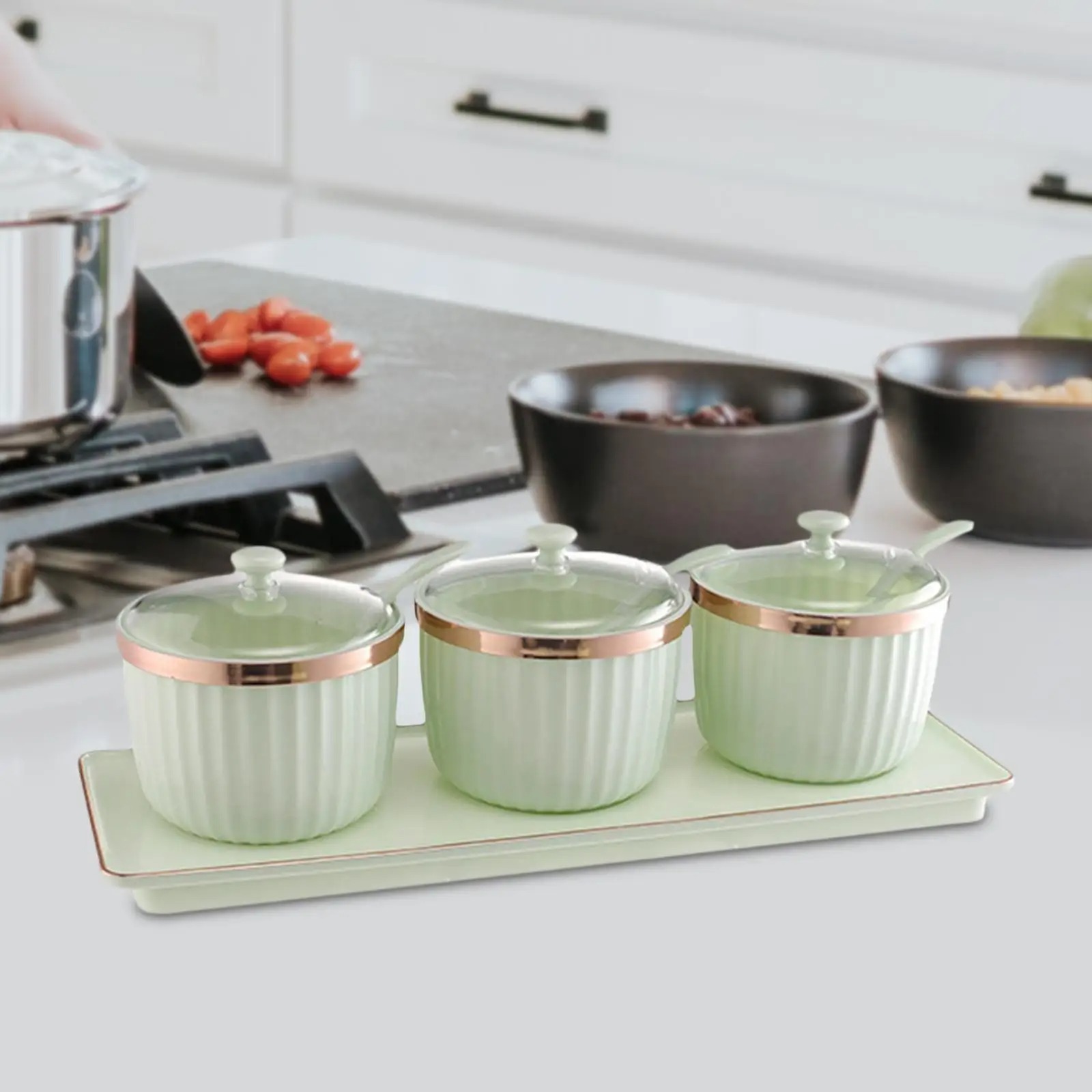Сет од 3 садови за зачини со лажичка и послужавник
