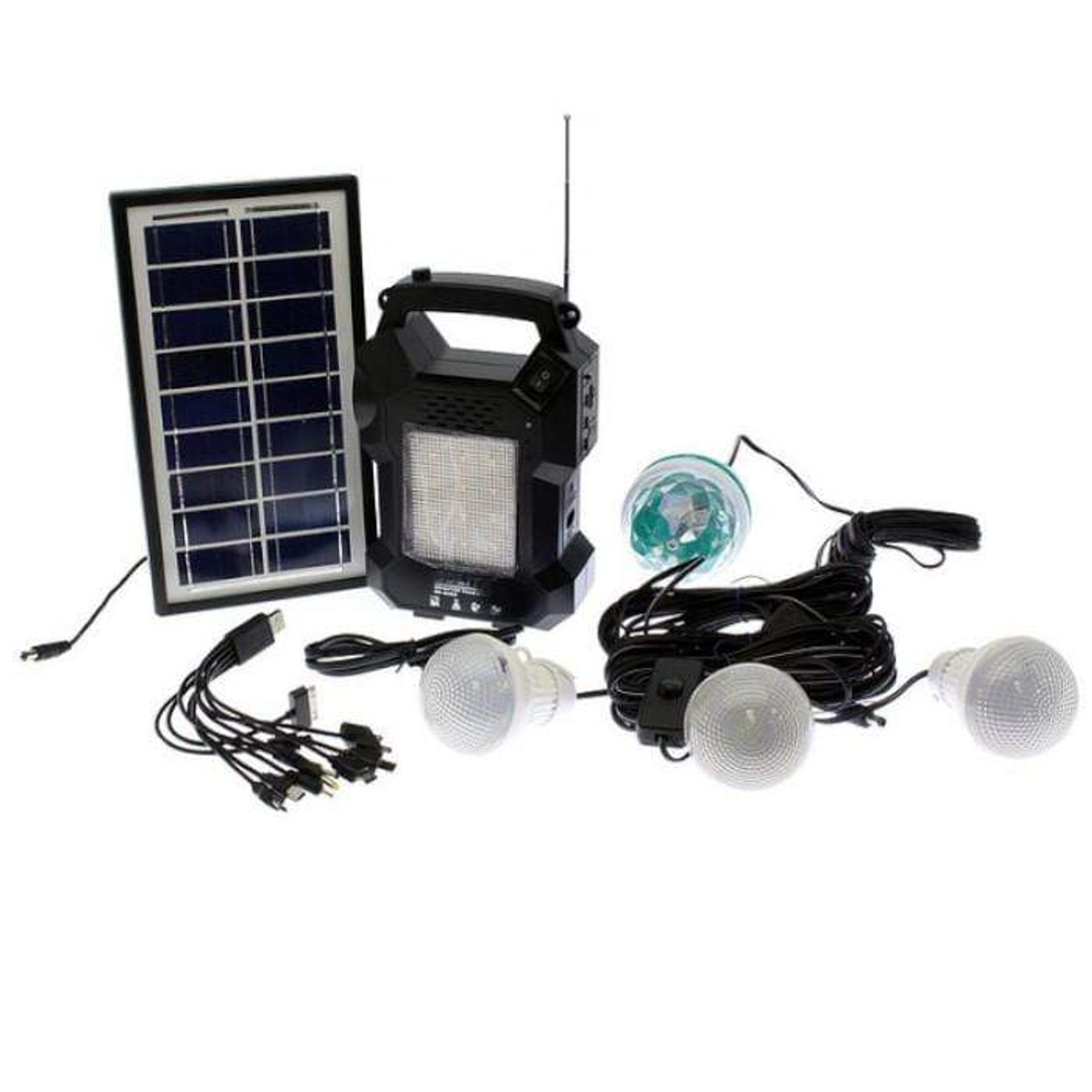 - Во комплетот се вклучени: соларен панел 9V–3-7W (со 3m кабел), вградено SMD LED светло со 12 диоди, вградена батериска лампа со висока осветленост, електронска контролна единица, 3 LED светилки (секоја од 3W, секоја со кабел од 5m) и 1 LED RGB диско ротирачка светилка од 3W