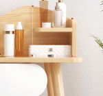 Оваа тоалетна маса има просторен површински дел, идеален за чување на вашите шминки, парфеми и други лични предмети. Со своите вградени фиоки и полици, оваа маса ви овозможува да ги организирате и зачувате вашите предмети на едно место, што значително ќе ви помогне во одржувањето на ред и чистота во вашата соба.